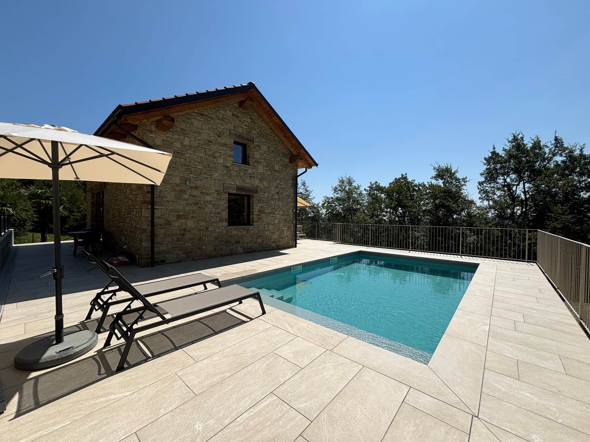 Eine asphaltierte Strasse bringt Sie den Hügel hinauf, durch Wald und Wiesen, bis vor das Haus. Dieses begrüsst Sie mit einer grosszügigen Terrasse und einem beheizbarem Salzwasser-Pool inmitten von Wald und Wiesen in Angrenzung an ein Naturschutzgebiet. Das Haus liegt isoliert von den anderen Häusern auf etwa 750m ü.M. Das Haus, der dazugehörige Pool sowie der komplett eingezäunte Garten (Höhe ca. 1m) stehen Ihnen exklusiv zur Verfügung (keine anderen Gäste). Der Parkplatz befindet sich direkt am Haus.