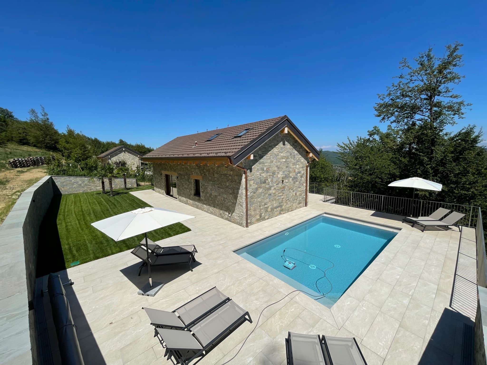 Our Lavanda house is the fourth house in our spacious resort nestled in the Piedmont hills around the village of Castelletto Uzzone. A paved lane leads you up the hill, through woods and meadows, past our two other houses, Stella, Pigna, and Peppola, right to the Lavanda house. The property, with its large tiled terrace and heated saltwater swimming pool, welcomes you in an oasis of tranquility among chestnut trees, offering sweeping views across the hills and valley. The house is detached from the other houses. It is identical in design to our houses Pigna and Peppola, but has two additional bedrooms and offers space for up to eight people over two floors and a gallery. The house, the adjoining pool, and the fully fenced garden are exclusively yours (no other guests).